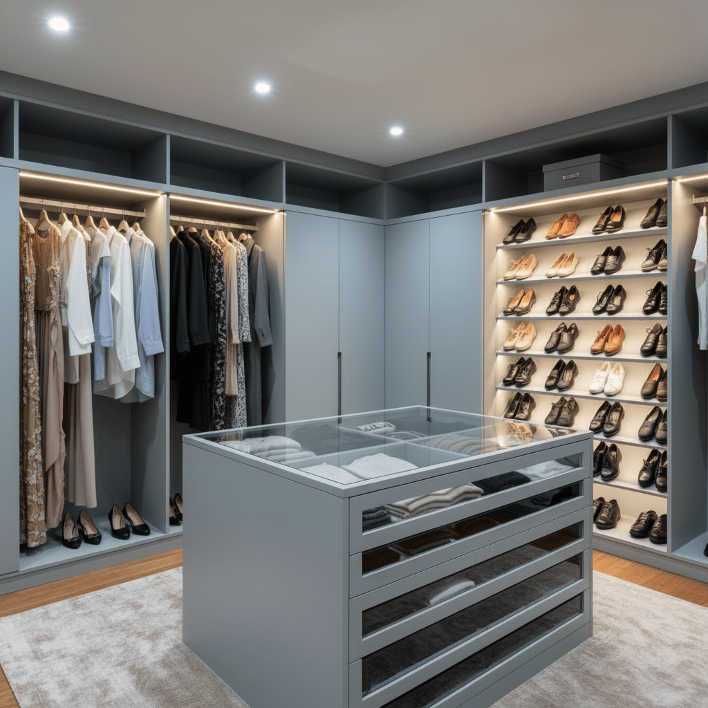 Transform your master bedroom into a luxury dressing room with designated zones for clothing, shoes, and accessories. Our RTA systems include adjustable shelving, multiple hanging heights, drawer units, and island options. Perfect for maximizing space while keeping everything visible and accessible. Starting at $3,000.