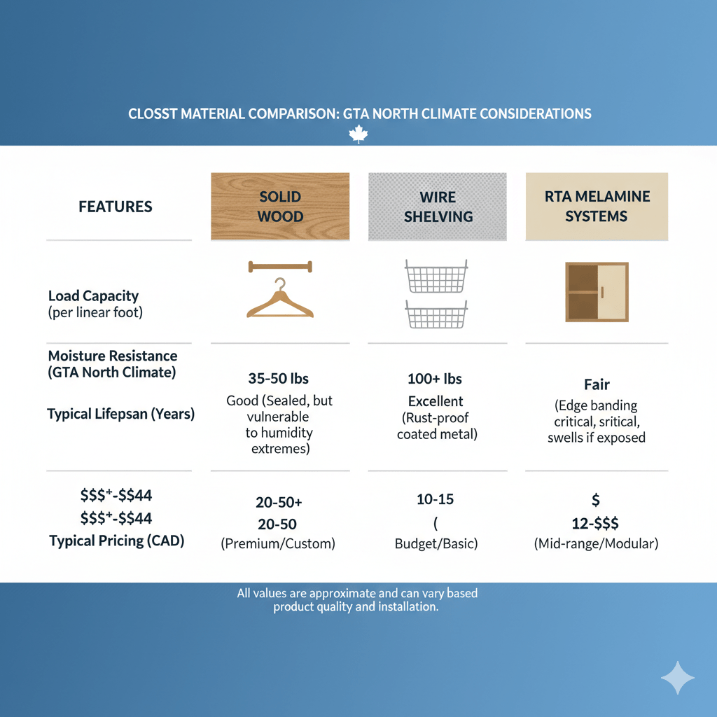 Your closet material isn’t just about looks – it’s about surviving everything from Toronto’s humid summers to Barrie’s bone-dry winter heating. The GTA North region experiences humidity fluctuations ranging from 20% to 65% relative humidity, creating expansion and contraction cycles that can cause damage to poorly chosen materials within 5 years.
