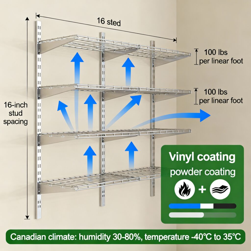 Wire systems excel in specific applications where ventilation and maximum load capacity take precedence over aesthetic concerns. ClosetMaid’s ShelfTrack Heavy Duty achieves 100 lbs per linear foot capacity when standards are stud-mounted at maximum 16″ spacing – double the capacity of most wood alternatives.
