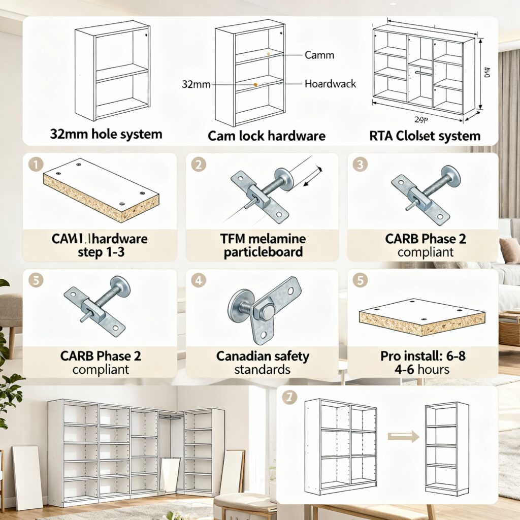 RTA (Ready-to-Assemble) systems dominate the Canadian market through engineered material optimization, delivering professional results at accessible pricing. Standard 3/4″ (18mm) thermally fused melamine over particleboard core costs $44.99-49.99 CAD per 4’x8′ sheet at major retailers, providing the substrate for systems ranging from IKEA’s budget PAX line to premium EasyClosets configurations.