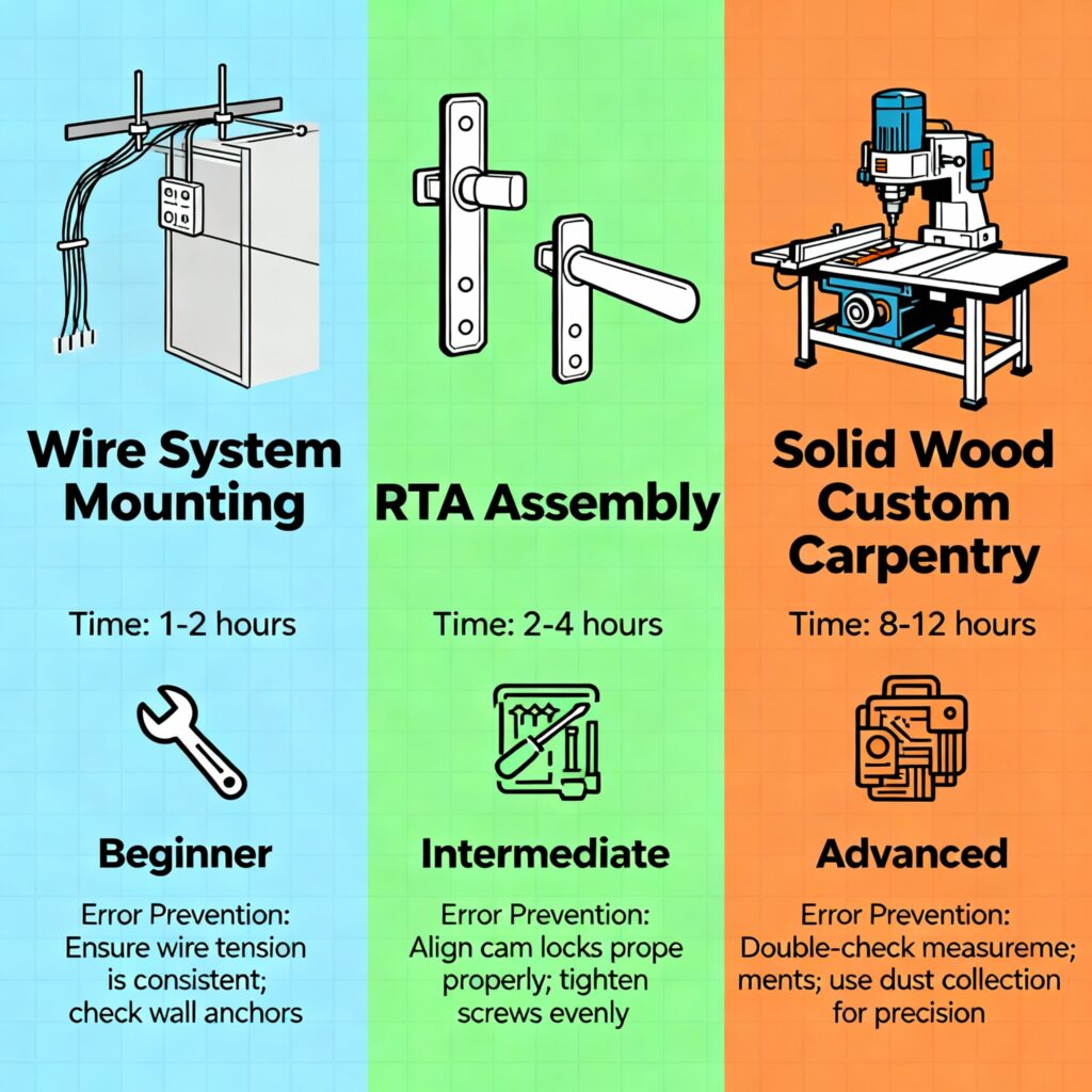 Cost analysis reveals surprising value propositions. Wire systems demonstrate the lowest total cost of ownership, ranging from $1,150 to $3,050 over 15 years, including maintenance and component replacement costs. Installation requires only 2-4 hours of DIY work or 0.5 days of professional work for standard reach-in closets.